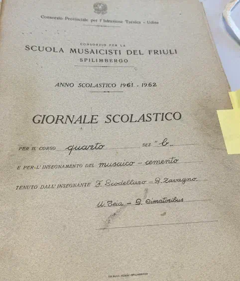 Dal “Giornale Scolastico”, trovato tra i documenti d’archivio, leggiamo i nomi degli insegnanti delle materie principali, attivi in quel periodo nella scuola. Spiccano quelli di grandi artisti, come il mosaicista, pittore e scultore Nane Zavagno (1932-1925), artista poliedrico che aveva frequentato la scuola prima come allievo e poi come maestro. Come mi spiega la segretaria commentando uno dei mosaici esposti nei corridoi della scuola, Zavagno fu tra i primi negli anni Cinquanta ad innovare la tecnica musiva, abbandonando la disposizione a tessere uniformi per privilegiare la tecnica diretta, che esalta le caratteristiche intrinseche dei materiali, in particolare quelli naturali, e ragiona sulla sintesi dei colori e sugli effetti chiaroscurali di una superficie.